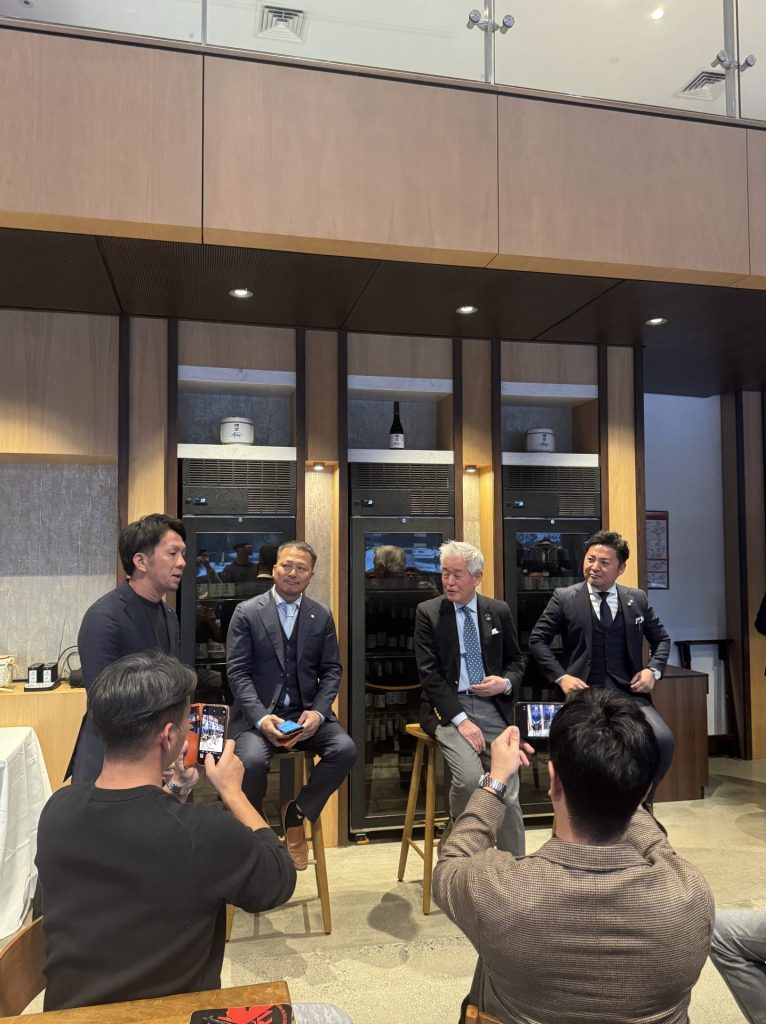 最近の話題 ニューヨーク、サンフランシスコ研修視察(DAY2) 岡田 祥平 2025年12月20日 DAY1に続き、ニューヨーク滞在DAY2の様子をレポートします。 まずは、DAY2の目的地まで車で約2時間の道のりのため、途中のサービスエリアでトイレ休憩を行いました。 500mlのペットボトルが2本で$6(約1,000円)。改めて物価の高さを感じます(-_-;) 目的地近くにはハドソン川が流れており、綺麗な風景が広がります。 DAY2の目的地、「獺祭Blue」に到着です。獺祭Blueは山口県の酒蔵 獺祭酒造がアメリカで製造・販売している獺祭ブランドの日本酒です。 早速、ガイドの方に案内していただき、獺祭Blueのギャラリーを見学です。 お酒を造る様子を映像で分かりやすく解説してくれています。 麹部屋という場所らしいです。蒸した酒米(山田錦)に麹菌を繁殖させる場所みたいです。ここで気づいたのが、現地アメリカの方がスタッフとして多く働かれていました。 エヴァンゲリオンの作者とも知り合いらしく、映画にも獺祭が登場したようです。よく見てみるとフィギュアの右手に獺祭が握られてます。 日本酒の仕込み樽が整然と並んでいます。全部で20基以上ありますが、現在の生産量的に7~8基が稼働しているとのことでした。 見学終了後、ここの醸造所で作られている3種類のお酒、純米大吟醸50%、35%、23%を試飲させていただきました。ちなみに、割合はお米の磨き割合を表しています。 今回、桜井会長自らこれまでの獺祭が歩んできたストーリーから、これからの思いをお話しいただきました。 桜井会長、青木副会長、柴沼委員長の3名でパネルディスカッションを実施しました。 終了後は、獺祭Blue専属シェフによる料理を堪能しながら、立食パーティを行いました。 帰りのバスの様子。ニュージャージー側からマンハッタンの夜景を眺めて、DAY2は終了となりました。 DAY3に続く